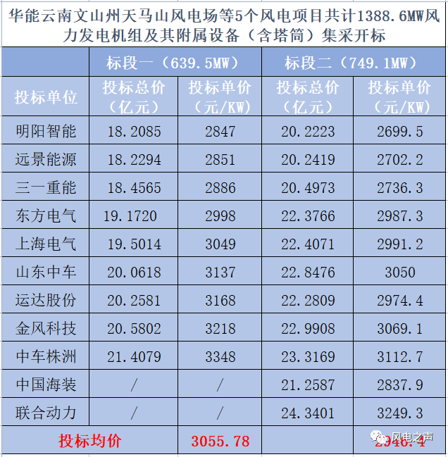 近期,華能云南1388.6MW風電項目公布投標報價。在第二標段中,明陽智能報出了2699.5元/KW,遠景能源報出2702.2元/KW的含塔筒報價。