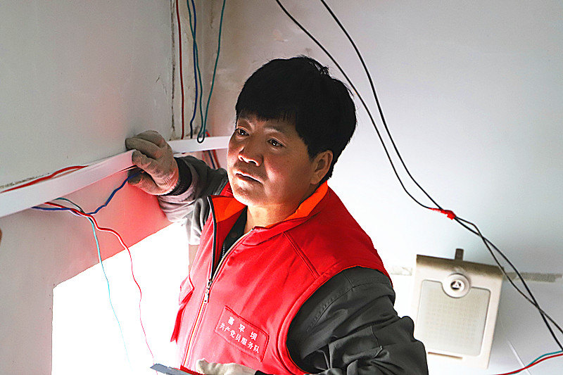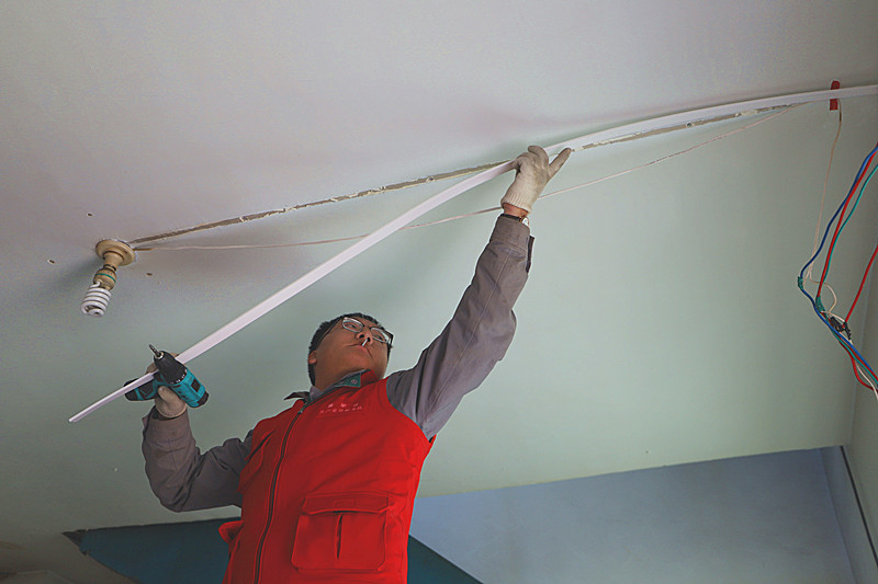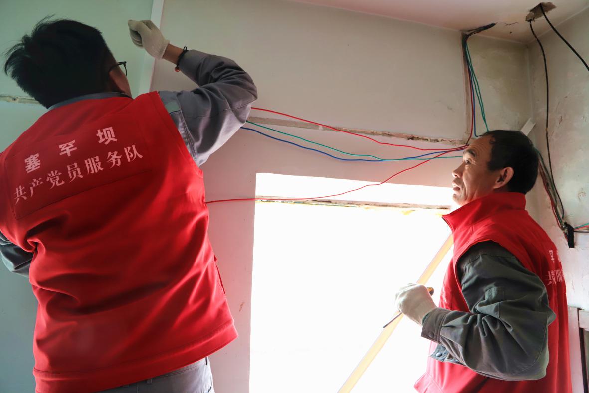 李啟龍你在屋里規整線路,張坤、李振楠在外屋重新更換插座、開關和導線,我與董鵬飛負責二樓線路規整,大家注意安全,行動。5月19日,塞罕壩共產黨員服務隊隊長楊明爽與隊員,為天橋梁望火樓更換室內用電設備的一個縮影。
