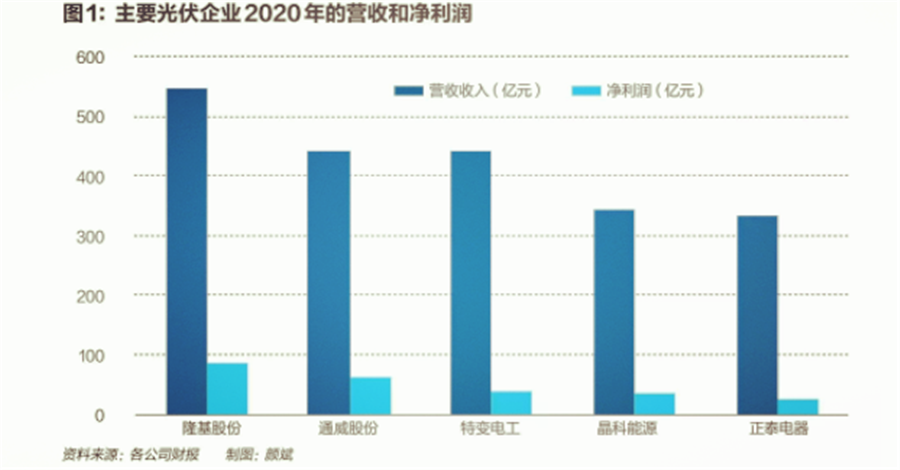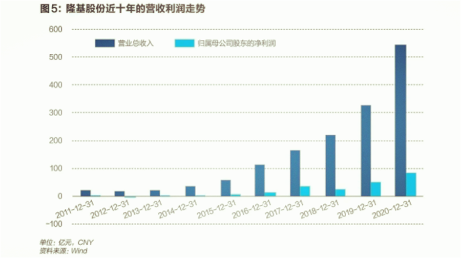 2020 年,隆基股份在光伏硅片市場的份額連續(xù)第三次占據(jù)榜首,在組件市場的份額首次獲得全球第一。同時,隆基首次成為了光伏行業(yè)營收、凈利潤雙料冠軍,分別為545.8億元和85.5億元。