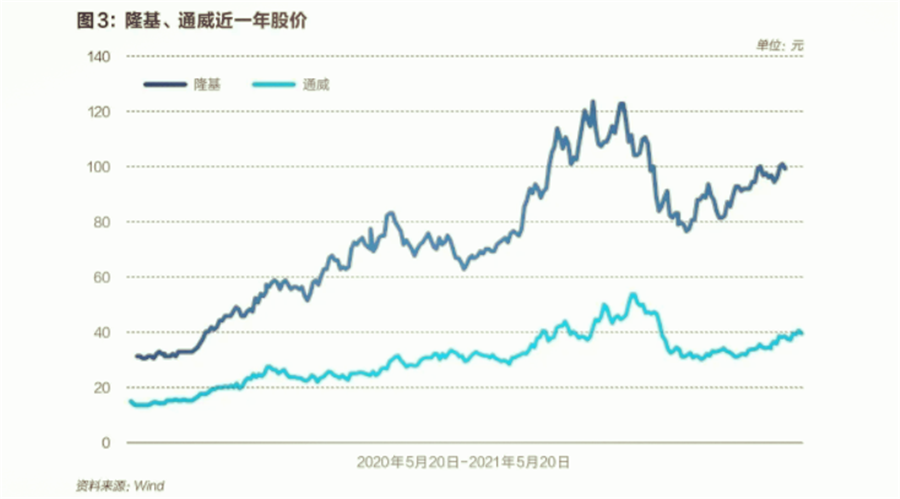 對于整個光伏行業(yè)來說,2021年具有里程碑意義:光伏進入平價時代,碳中和目標(biāo)帶來空前利好。多家光伏上市公司股價暴漲,隆基股份的市值從2019年8月的1000億元,漲到了如今的3600億元左右。行業(yè)第二名通威股份如今市值在1600億元左右,同比上漲約150%。
