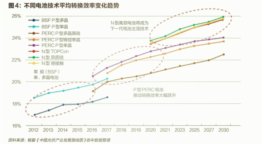 PERC電池是當(dāng)前光伏行業(yè)的主流電池。業(yè)內(nèi)認為,基于P型硅片的PERC電池轉(zhuǎn)換效率已接近極限,另一類基于N型硅片的電池里將誕生下一代高效電池。