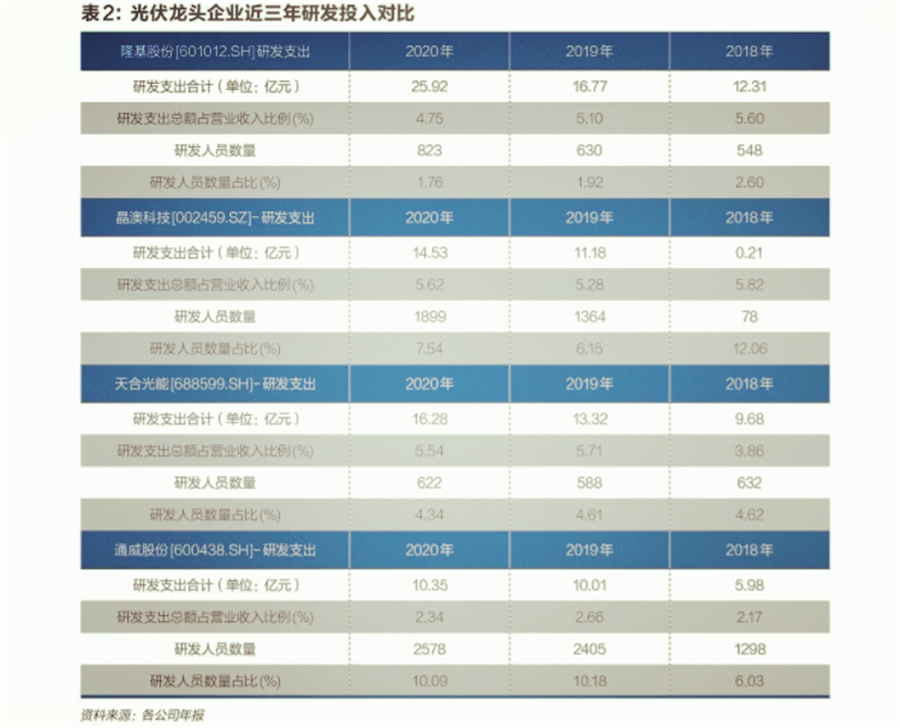 2020年,隆基的研發(fā)人員數(shù)量為823人,研發(fā)投入為25.92億元,占營收的比例為4.75%。同期,另一光伏龍頭企業(yè)天合光能(688599.SH)研發(fā)人員數(shù)量為622人,研發(fā)投入為16.28億元,占營收總額的比例為5.54%。