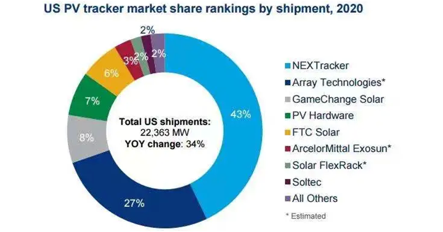 2020年,在美國(guó)市場(chǎng)22.36GW的出貨總量中,NEXTracker和Array Technologies以70%的絕對(duì)優(yōu)勢(shì)占據(jù)了大部分的市場(chǎng)份額。得益于ITC政策的延期,美國(guó)市場(chǎng)的供應(yīng)商在鞏固原有份額的基礎(chǔ)上獲得了進(jìn)一步的增長(zhǎng)。