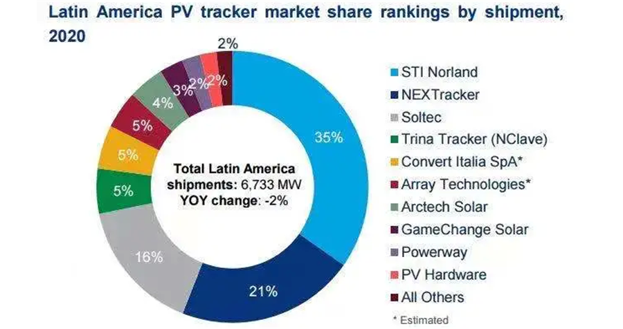 2020年,拉丁美洲市場(chǎng)跟蹤支架出貨6.73GW,雖然巴西和智利都有不同程度的增長(zhǎng),但是整個(gè)地區(qū)與上一年相比僅增長(zhǎng)2%。STI Norland公司的出貨占比明顯增長(zhǎng)。從上一年的17%提高到了35%,穩(wěn)居該市場(chǎng)第一位。NEXTracker 和Soltec則分別排在第二和第三。