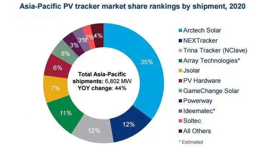 圖片:2020年亞太市場(chǎng)光伏跟蹤支架出貨排名 來(lái)源:伍德麥肯茲