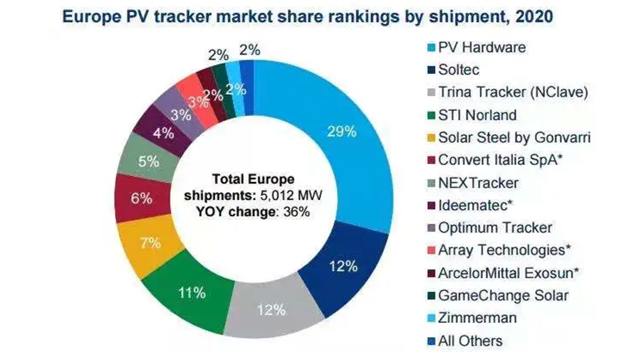 2020年歐洲地區(qū)的出貨量占全球的11%,達(dá)到了5GW。與2019年相比,市場(chǎng)更加分散和多元化。PV Hardware以29%的市場(chǎng)份額占據(jù)了頭部位置。Soltec和Trina Tracker則以微小的差距分別排在了第二和第三。