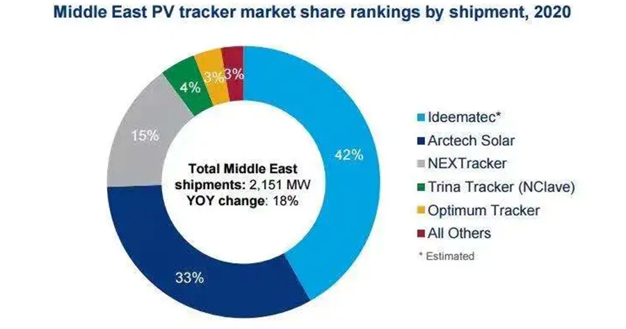 中東市場(chǎng)在2020年總計(jì)有2.15GW的光伏跟蹤支架出貨,Ideematec和中信博分別以42%(估算數(shù)據(jù))和33%的市場(chǎng)占比排在前兩位。NEXTracker以15%的市場(chǎng)占比排在第三位。