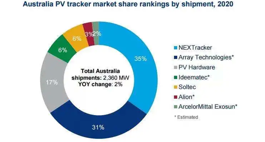 與去年相比,2020年澳大利亞市場(chǎng)僅增長(zhǎng)了2%,出貨量為2.36GW。NEXTracker和Array Technologies分別以35%和31%的市場(chǎng)份額排在前兩名。PV Hardware以17%的份額排在第三。