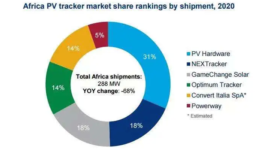 圖片:2020年非洲市場(chǎng)光伏跟蹤支架出貨排名 來(lái)源:伍德麥肯茲