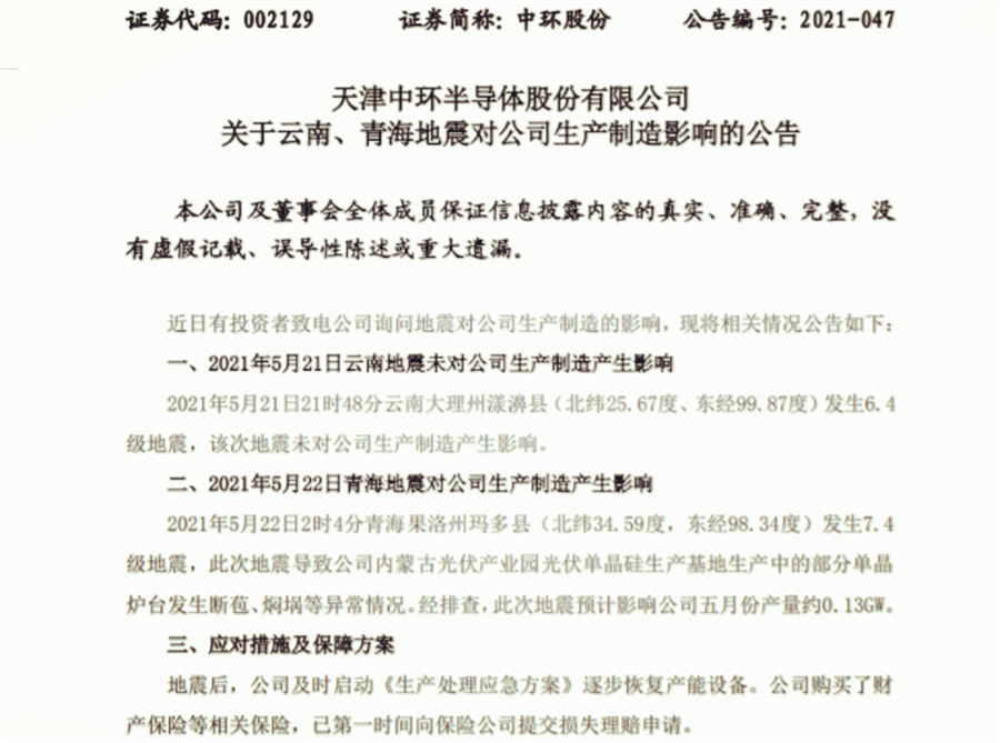5月22日2時4分青海果洛州瑪多縣(北緯34.59度,東經98.34度)發生7.4級地震,此次地震導致中環股份內蒙古光伏產業園光伏單晶硅生產基地生產中的部分單晶爐臺發生斷苞、燜堝等異常情況。經排查,此次地震預計影響公司五月份產量約0.13GW。