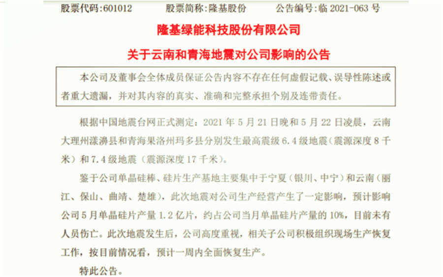 響5月24日晚間,隆基股份發布關于云南和青海地震對公司影響的公告。公告表示,根據中國地震臺網正式測定,2021年5月21日晚和5月22日凌晨,云南大理州漾濞縣和青海果洛州瑪多縣分別發生最高震級6.4級地震(震源深度8千米)和7.4級地震(震源深度17千米)。
