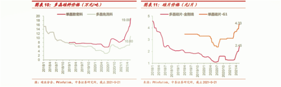 則表示,當前硅料價格持續上漲,單晶方面,五一后成交價在缺料的影響下進一步上揚,目前一線企業已經有價無貨;多晶方面,價格跟隨單晶料漲價。同時,硅片價格上漲,單晶方面,硅料短缺影響開工率,電池廠反應硅片長單交付量不足,價格堅挺;多晶方面,印度需求受疫情影響稍有放緩,但硅料上漲繼續推高價格。