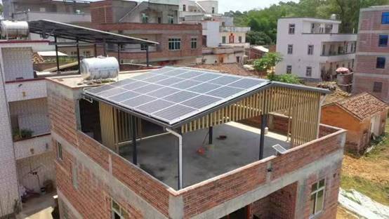 三方在以上創新合作模式的推動下,廣東茂名化州已經形成第一批“樣板”。農房改造型光伏陽光亭是茂名推進“碳中和新鄉村”建設的先行項目。化州市新安鎮新塘村太平塘的第一批示范性光伏陽光亭在如火如荼建設中,示范樣板由4條立柱支撐起一個“人”字形的屋頂,屋頂兩側斜面為光伏板,面積約50平方米。