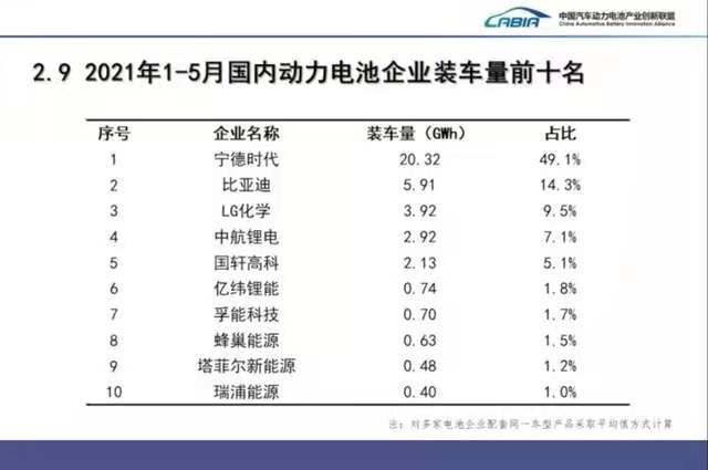 企業(yè)集中度方面,今年5月,我國(guó)新能源汽車(chē)市場(chǎng)共計(jì)41家動(dòng)力電池企業(yè)實(shí)現(xiàn)裝車(chē)配套,較去年同期增加1家。排名前3家、前5家、前10家動(dòng)力電池企業(yè)動(dòng)力電池裝車(chē)量分別為7.3GWh、8.5GWh和9.0GWh,占總裝車(chē)量比分別為74.5%、87.1%和92.5%。另外,月度裝車(chē)量排名前五的動(dòng)力電池企業(yè)分別為寧德時(shí)代、比亞迪、LG化學(xué)、中航鋰電、國(guó)軒高科。