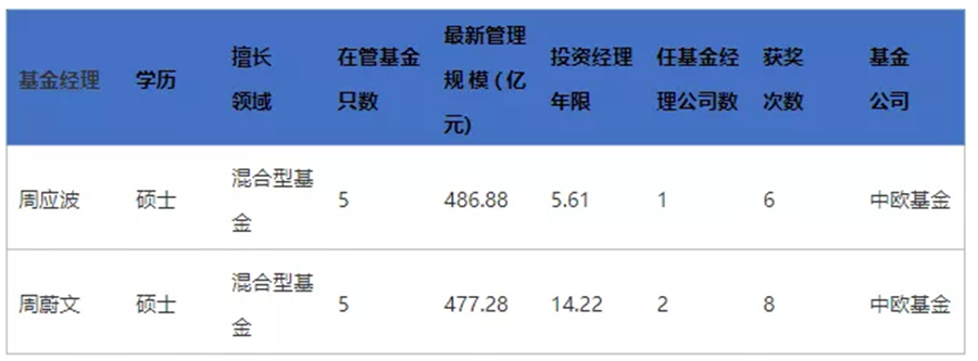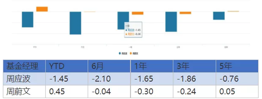 目前周蔚文和周應波在管基金數(shù)量均為5只,并且管理規(guī)模也十分接近,周蔚文的管理規(guī)模為477.28億元,周應波的管理規(guī)模為486.88億元。