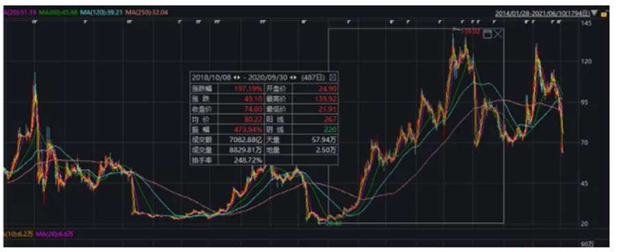 作為鋰電材料的龍頭,贛鋒鋰業(yè)(002460.SZ)的市值從2010年8月10日上市以來的59億元抬升至如今的1400億元,期間經(jīng)歷了幾波上漲。到了2021年1月25日,股價更是達到歷史最高點149.3元/股。但隨后,贛鋒鋰業(yè)經(jīng)歷了長達兩個月左右的回調,直到6月才反彈至前期高點附近。