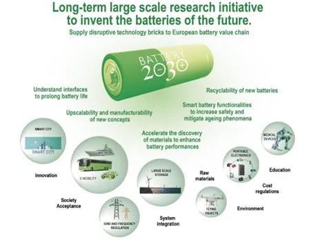 《電池2030+(BATTERY2030+)》是一項大規模的歐洲長期研究計劃,為歐盟委員會提出的戰略能源技術計劃(SET-plan)的想法之一,旨在聯合歐洲整體解決未來電池研發過程中所面臨的各項挑戰,克服重重阻力達成宏大的既定的電池性能目標。研究內容以“化學中性途徑(chemistry neutral approach)”為導向,基于現有或未來多種不同類型的電池化學物質,通過縮小各自之間的差距來發揮其全部潛力以實現電池的實際能力和理論極限。理念上基于給歐洲電池企業乃至全球電池企業的價值鏈提供新的發展和支持,比如從原材料到先進材料的發展,到電池和電池包的設計制造,電池壽命終止后的回收利用和電池實際應用場景等。除此之外,《電池2030+》的長期發展路線圖也充分地彌補了歐洲電池內部的中期研究和創新工作–歐洲技術和創新平臺(ETIP)。