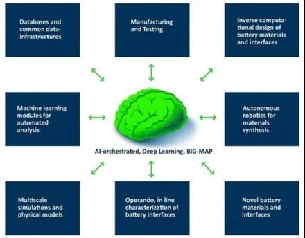 從能源技術的生產,存儲到最終交付使用,材料的發現和開發始終貫穿于整個過程。特別對于新興的電池技術,先進材料幾乎是所有清潔能源創新的基礎。若依靠現有的傳統重復性試驗開發過程,需要耗費大量的時間,人力物力去開發新型高性能電池材料并用于電池設計,這一過程從最初發現到完全實現商業化可能長達10年之久。因此,在《電池2030+》項目中,為了加速超高性能的,可持續發展的智能型電池開發,計劃在歐洲范圍內設立電池“材料加速平臺(MAP)”,并與電池界面基因組(BatteryInterface Genome,BIG)集成在一起。同時BIG-MAP基礎設施模塊化設置,全系統具有高度的通用性,以便能夠容納所有新興的電池化學體系,材料成分,結構和界面。另一方面,MAP將利用人工智能(AI)從許多互補的方法和技術中集成和編排數據,整合計算材料設計,模塊化和自主性綜合機器人技術和先進表征,實現全新的電池開發策略。促進材料,工藝和設備的逆向設計和定制。最終,在MAP框架下由每個核心元素構建概念電池,開發出具有突破性的電池材料,極大提高電池開發速度和電池性能。