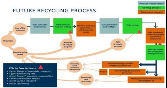 b. 引入現代低碳足跡物流概念:包括分散式處理,開發產品可追溯性,特別是整個電池生命周期中關鍵原材料的可追溯性。以及開發對有價值關鍵材料的高效、低成本和可持續的一步回收處理策略,并將其“翻新”為電池可用活性材料,如果不能完全逆轉,則通過調整組成來合成活性材料前驅體或相關原材料。