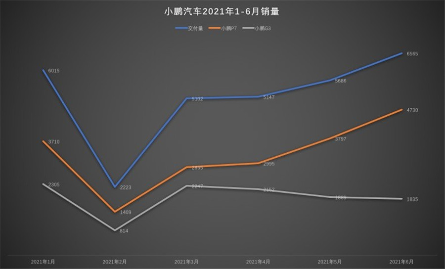 另一方面,盡管整體銷量保持增長態勢,但小鵬汽車所推出的首款車型G3的銷量卻在不斷下滑。2021年6月,小鵬汽車的交付量為6565輛,其中小鵬P7的交付量為4730輛。