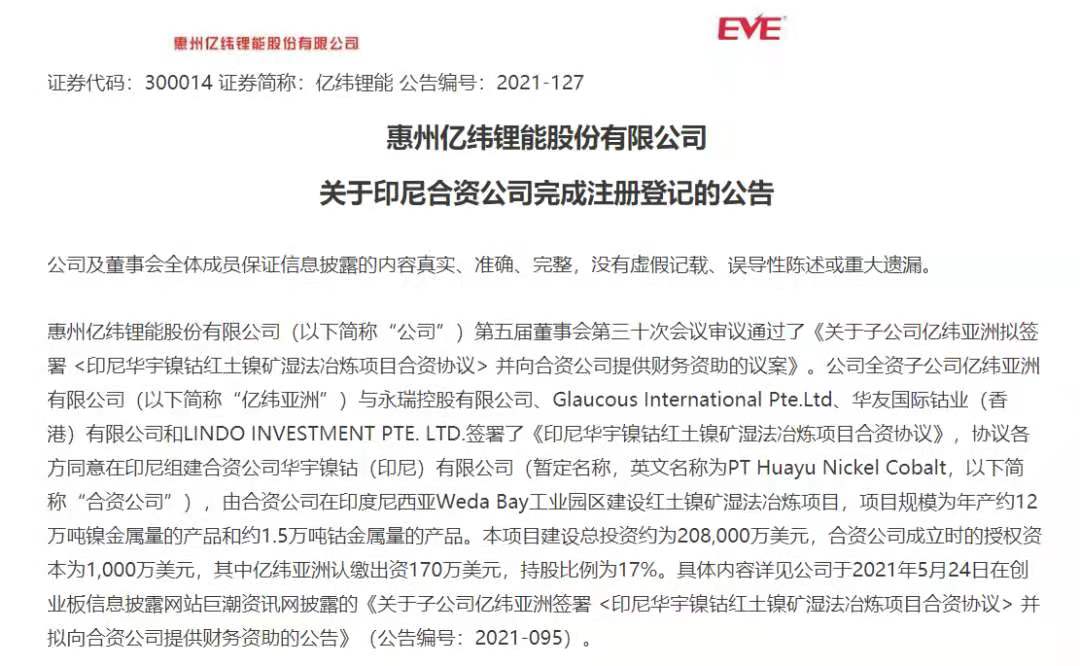 億緯鋰能印尼公司完成注冊(cè)公告,截圖自Wind