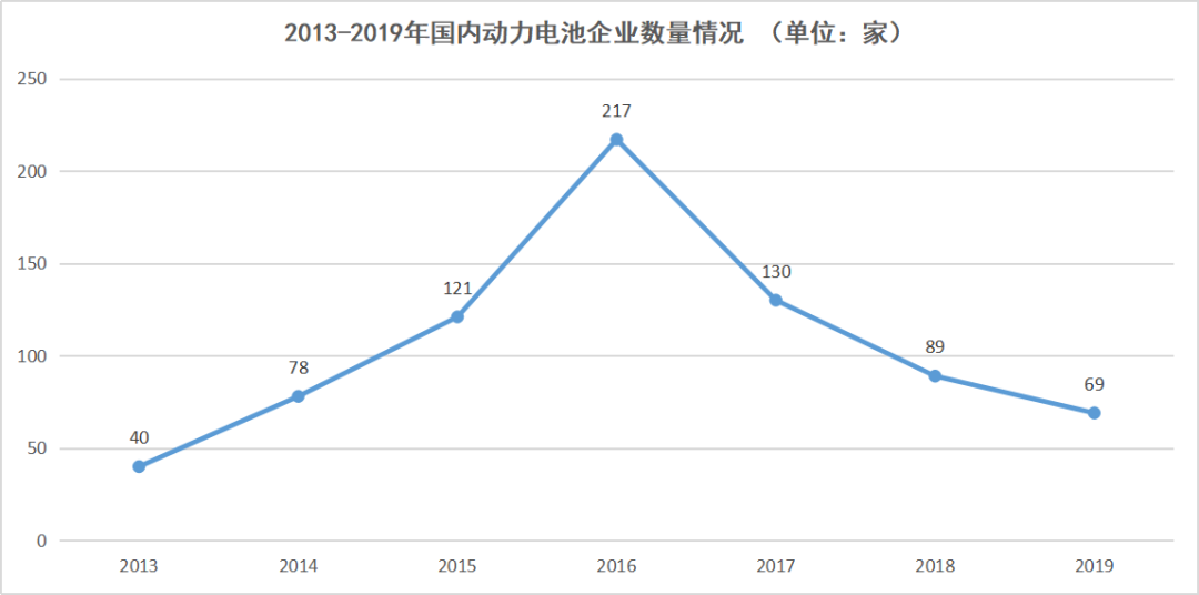 受此影響,國(guó)內(nèi)動(dòng)力電池行業(yè)中企業(yè)的數(shù)量也從2016年的217家,迅速跌落至2019年的69家。