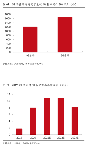 對于磁性元器件行業(yè)來說,5G基站和智慧燈桿的大力推廣與發(fā)展帶來了很大的市場發(fā)展空間,如:射頻電感、功率電感等。根據(jù)產(chǎn)業(yè)調研、西部證券研發(fā)中心的數(shù)據(jù)顯示,5G基站的電感需求用量將會提升30%以上,電感用量從原來4G基站的1100-1300顆,到如今5G基站的1600-1700顆。而且總需求量也在不斷上升。
