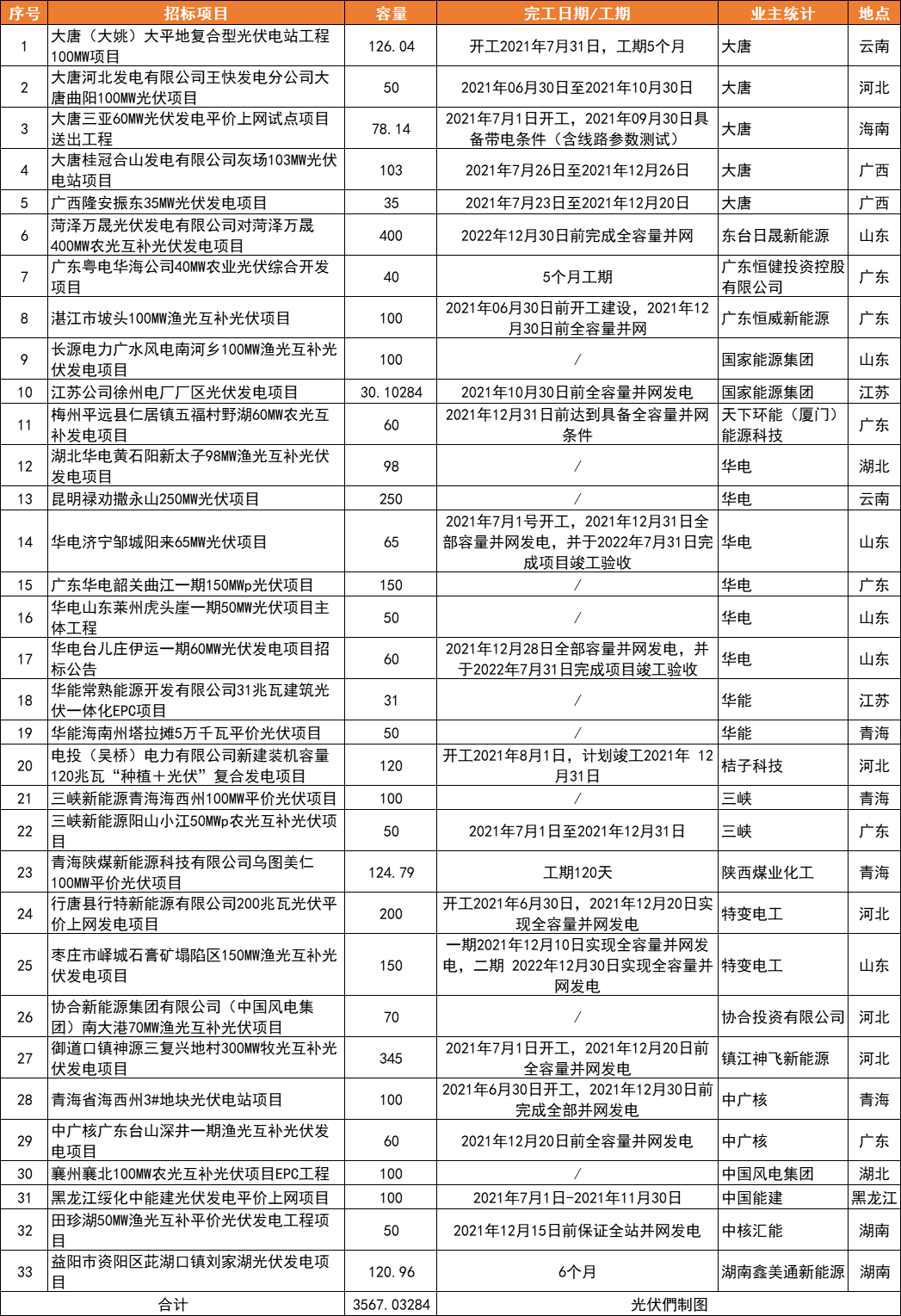 從統計項目的并網時間來看,大部分依然集中于2021年底前并網,其中約1.5GW為2019年和2020年的存量項目;從統計的招標容量來看,TOP 5分別是華電(673MW)、東臺日晟新能源(400MW)、大唐(392.18MW)、特變電工(350MW)、鎮江神飛新能源(345MW)。其中東臺日晟新能源400MW容量為菏澤萬晟400MW農光互補光伏發電項目,該項目要求2022年12月30日前完成全容量并網。