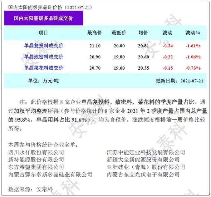從上游價格跟蹤來看,根據硅業分會報價分析,本周多晶硅價格延續緩跌下行走勢,其中單晶復投料、單晶致密料、單晶菜花料成交均價跌幅都在1%左右。