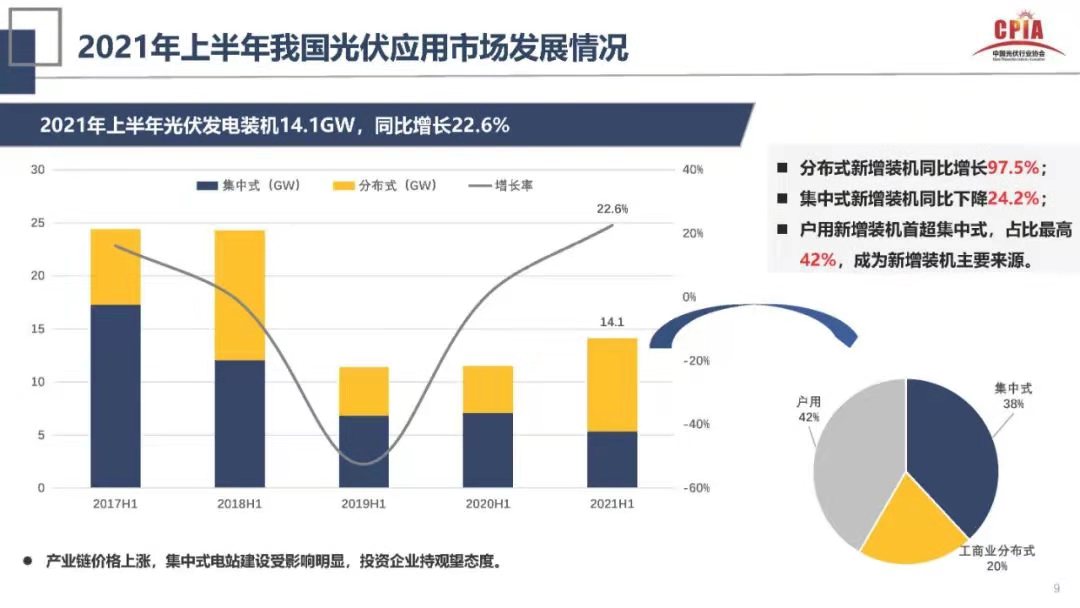 不過,相比于地面電站,今年分布式光伏市場有望迎來新突破。根據中國光伏行業協會數據,上半年光伏新增裝機14.1GW,其中分布式占比達到62%,戶用新增裝機占比42%,超過集中式電站,成為上半年新增裝機主要來源。