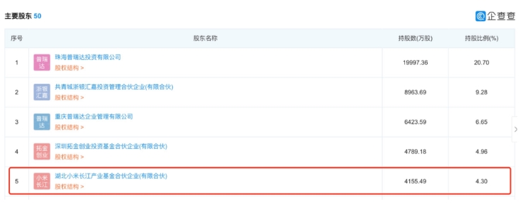 企查查數(shù)據(jù)顯示,2018年12月,小米產(chǎn)投就曾對(duì)珠海冠宇進(jìn)行了投資,持有珠海冠宇4.3%的股份,是其第五大股東。