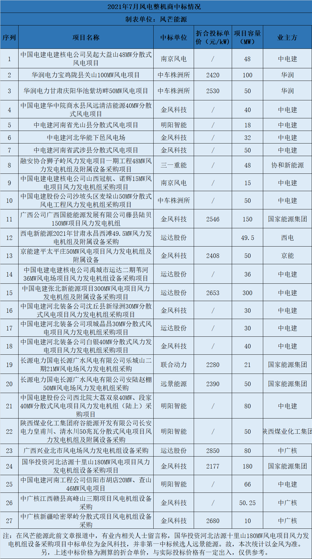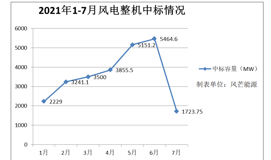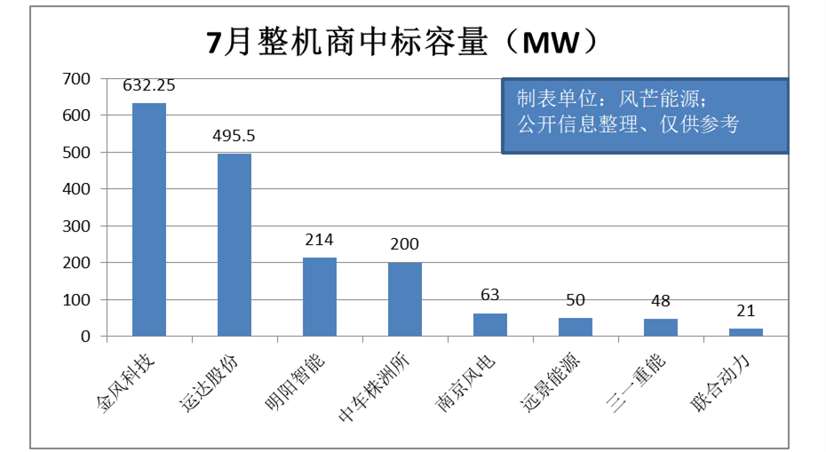 據(jù)風(fēng)芒能源不完全統(tǒng)計(jì),根據(jù)公開信息整理,7月份風(fēng)電市場一共中標(biāo)27個(gè)風(fēng)機(jī)采購項(xiàng)目、共計(jì)1723.75MW。(其中,金風(fēng)科技中標(biāo)632.25MW,位列第一。接下依次為:運(yùn)達(dá)股份(495.5MW)、明陽智能(214MW)、中車株洲所(200MW)、南京風(fēng)電(63MW)、遠(yuǎn)景能源(50MW)、三一重能(48MW)、聯(lián)合動(dòng)力(21MW)。)
