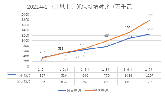該苗頭對風電來說,值得注意。風電、光伏的暗中賽跑自去年起就一直被大家關注。風電的新增裝機從今年3月份起就一直落后于光伏。風電與光伏的累計裝機差距也越來越小(7月底累計裝機容量相差2200萬千瓦)。