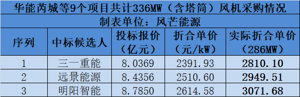 也就是說,華能芮城這批項目實際招標容量為286MW,三一的本次投標折合單價實際為2800元/kW。去除塔筒后(按400元/kW-500元/kW來算),風機折合單價大概在2300元/kW-2400元/kW左右。