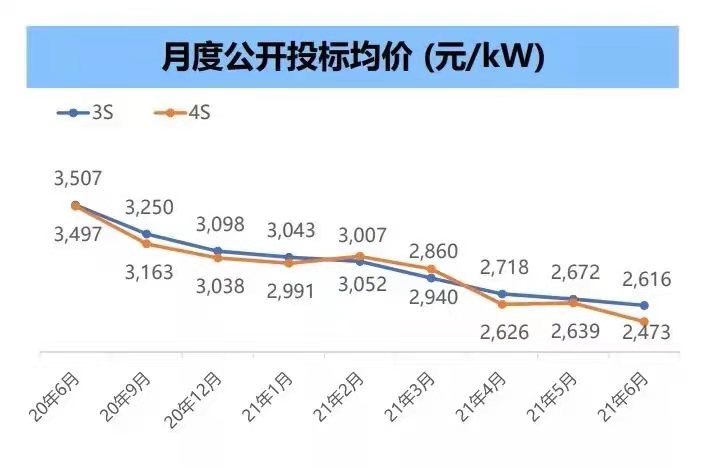 根據金風科技業績演示公示,2021年6月,3S平臺風機投標均價在2616元/kW左右,4S平臺風機投標均價在2473元/kW左右。