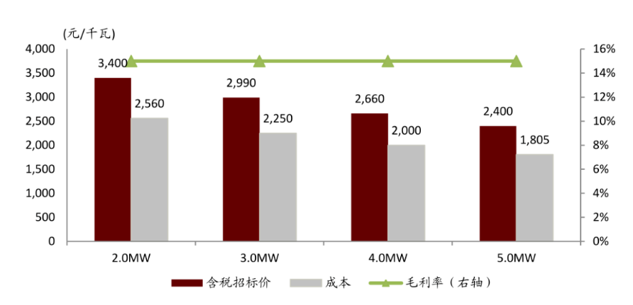 注:理論成本根據單位功率重量下滑測算,并假設15%的毛利率反推出理論招標價;未考慮原材料價格變動影響;與實際情況可能存在偏差,不代表廠商口徑