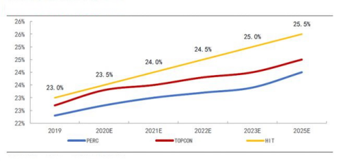 未來隨著國產化的逐步推進,以及硅片、銀耗、靶材多點齊降,HJT有望2022年單瓦成本與PERC持平,HJT或迎投產擴產潮。根據CPIA預測,HJT的市場份額將從2020年的3%增加至2025年的20%左右。