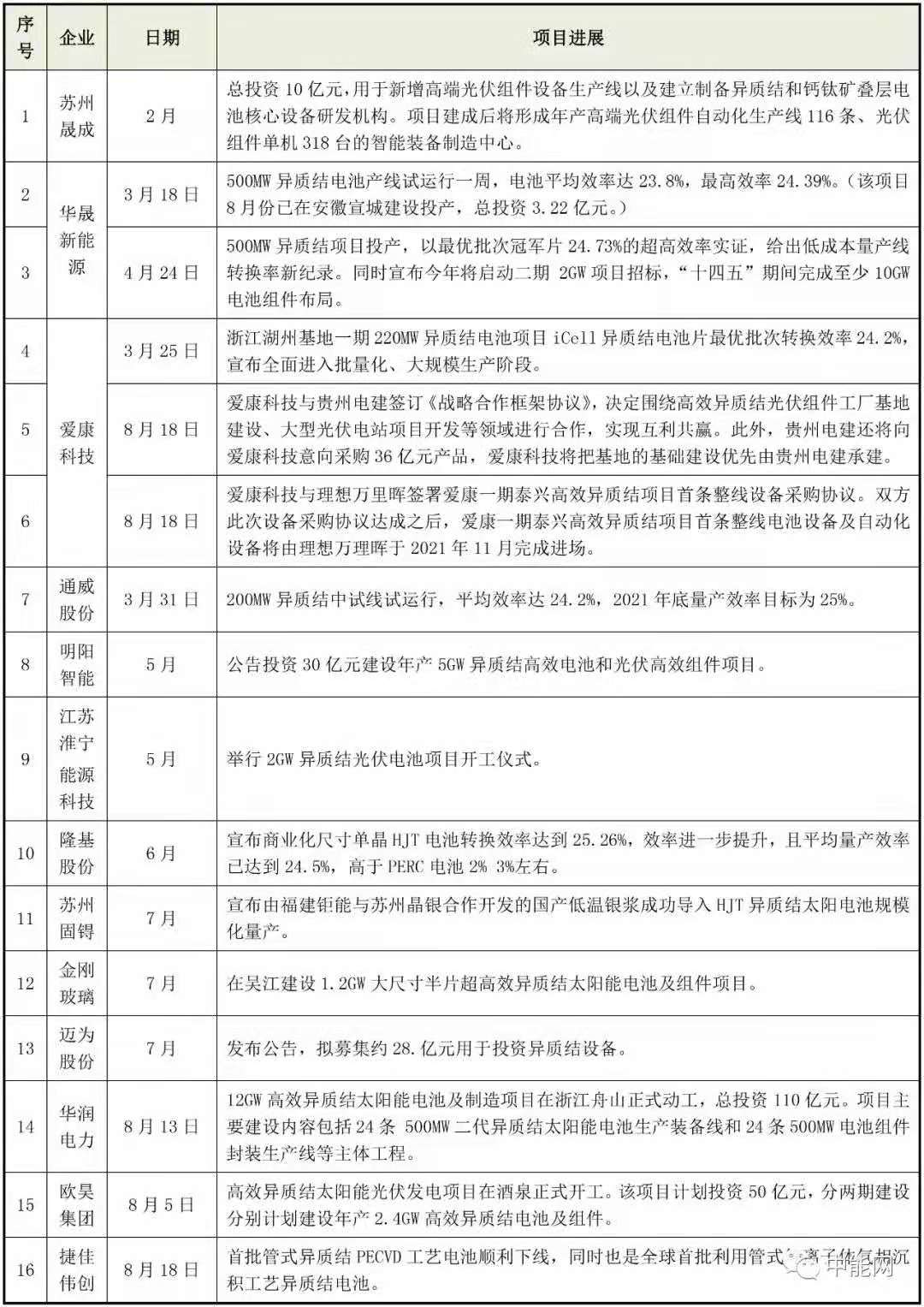 今年以來,HJT電池捷報頻傳,多家企業公布了中試線量產效率結果,產業化進程繼續加速。目前已量產或計劃量產HJT電池的企業有近20家,大多尚處于中試階段。