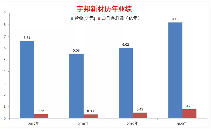 而在2020年我國光伏裝機量大幅增長的背景下,宇邦新材成功登上了新科組件出貨量冠軍隆基股份的快車,實現(xiàn)了營收和歸母凈利潤的大幅增長。其中,營收增長了36%,歸母凈利潤增長了61.2%。