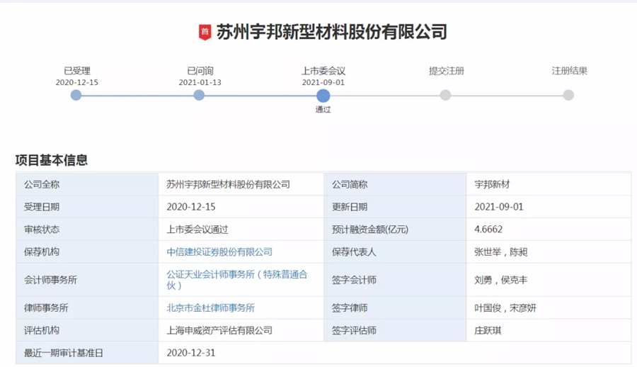 9月1日,據(jù)深圳證券交易所創(chuàng)業(yè)板發(fā)行上市審核信息公開網(wǎng)站顯示,蘇州宇邦新型材料股份有限公司(以下簡稱“宇邦新材”)已通過上市委會議,將于深交所創(chuàng)業(yè)板上市。