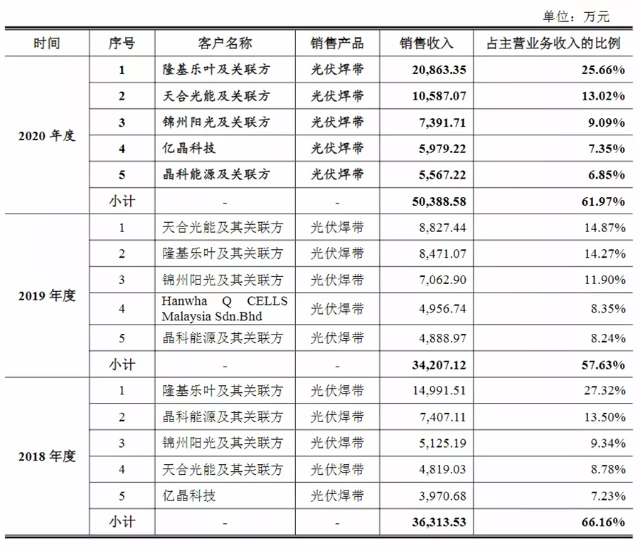 根據(jù)宇邦新材的招股說明書顯示,2019年,隆基股份是宇邦新材的第二大客戶,銷售收入為8471萬元,占比還稍低于天合光能。但在2020年,隆基股份不僅成為了宇邦新材第一大客戶,同時銷售收入也提高至2.086億元,占比高達25.66%。是其營收增長的重要支撐。