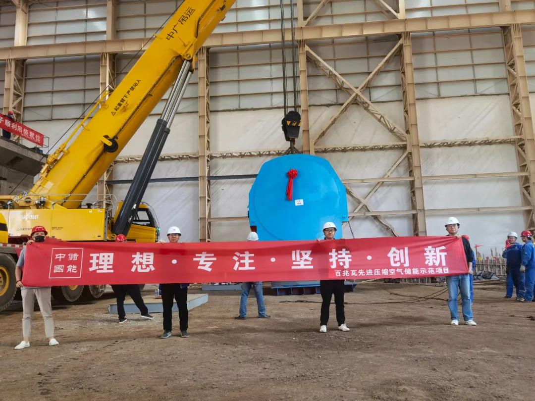 該項目是國家發(fā)改委立項支持的國家可再生能源示范區(qū)重大示范項目,是國際首套100MW先進(jìn)壓縮空氣儲能示范電站,建設(shè)規(guī)模為100MW/400MWh,系統(tǒng)設(shè)計效率70.4%,項目建設(shè)地為河北省張家口市張北縣廟灘云計算產(chǎn)業(yè)園。項目由張北巨人能源有限公司(巨人集團)投資,技術(shù)來源為中國科學(xué)院工程熱物理研究所,由中儲國能(北京)技術(shù)有限公司提供全套設(shè)備。此次定子吊裝的順利完成,標(biāo)志著張家口國際首套100MW先進(jìn)壓縮空氣儲能國家示范電站進(jìn)入核心設(shè)備安裝的關(guān)鍵階段,目前各項工作進(jìn)展順利。