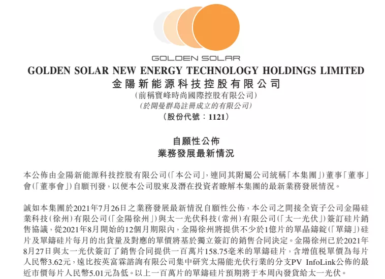 公告稱,公司間接全資子公司金陽硅業(yè)科技(徐州)有限公司(以下簡稱"金陽徐州")與太一光伏科技(常州)有限公司(以下簡稱"太一光伏")簽訂硅片銷售協(xié)議,從2021年8月開始的12個月期限內(nèi),金陽徐州將提供不少于1億片的單晶鑄錠("單鑄")硅片及單鑄硅片每月的出貨量及對應的單價將基于獨立簽訂的銷售合同決定。