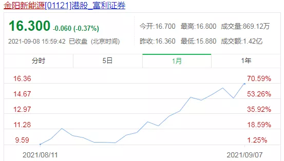 從7月28日更名為金陽新能源至今,其股價已從每股5.0港元上漲至9月8日收盤后的16.30港元,不到兩個月時間漲幅就高達226%。