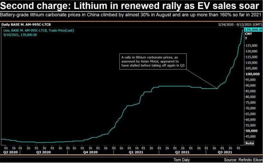 今年以來,中國碳酸鋰現貨價格上漲170%至14.2萬元人民幣/噸,創下2018年4月以來新高價,而在澳大利亞開采的鋰礦價格今年上漲144%至990美元/噸。