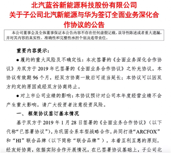 此外,公告顯示,基于2019年簽署的《全面業務合作協議》,北汽藍谷和華為簽訂補充協議,有效期達8年,雙方共同打造“ARCFOX” 和“HI”聯合品牌,在智能網聯車等領域加強聯合研發能力。
