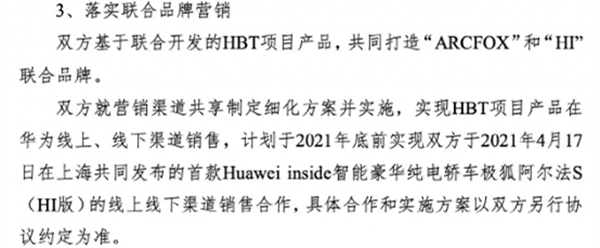 值得一提的是,公告還提到,雙方就營銷渠道共享制定細化方案并實施,實現HBT項目產品在華為線上、線下渠道銷售,計劃于2021年底前實現雙方于2021年4月17日在上海共同發布的首款Huawei inside智能豪華純電轎車極狐阿爾法S (HI版)的線上線下渠道銷售合作,具體合作和實施方案以雙方另行協議約定為準。