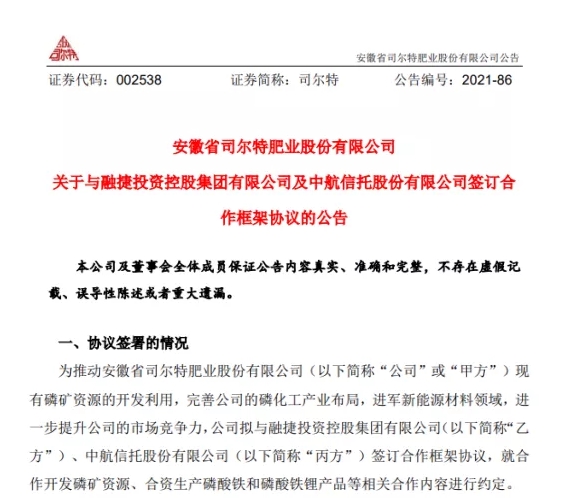 9月21日晚間,司爾特(安徽省司爾特肥業股份有限公司)發布公告稱,公司擬與融捷投資控股集團有限公司、中航信托股份有限公司簽訂合作框架協議,就合作開發磷礦資源、合資生產磷酸鐵和磷酸鐵鋰產品等相關合作內容進行約定。股權結構為:公司持有磷酸鐵鋰公司70%的股權,融捷投資持有磷酸鐵鋰公司30%的股權。