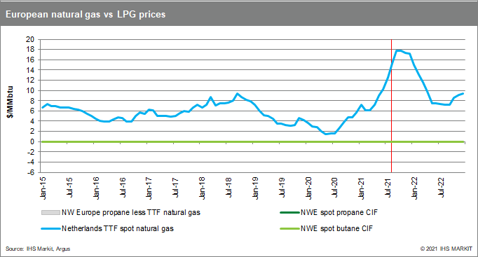 歐洲天然氣價格的持續飆升引發了一個問題,即包括液化石油氣在內的石油產品是否可以替代天然氣,以幫助緩解市場壓力。就液化石油氣而言,唯一可用的重要轉換是煉油廠內部,這可以增加丙烷作為工藝燃料的使用。從理論上講,使用足夠的丙烷可能對該地區的丙烷價格產生重大影響。丙烷目前的交易價格大大低于天然氣,這一事實表明,實際上,煉油廠燃料轉換量(以及對液化石油氣市場的影響)較小。在亞洲,天然氣和石油產品(包括液化石油氣)之間存在更直接的競爭;在中國,一些工業設施仍然可以在天然氣和液化石油氣之間轉換,但隨著法規越來越禁止,這種轉換能力越來越小。