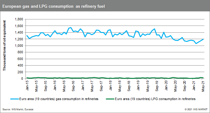 圖2顯示了歐洲煉油廠(本例中為歐元區19個國家)使用天然氣和液化石油氣作為燃料的情況。自2015年初以來,這些國家的煉油廠消耗的天然氣約為液化石油氣的67倍(以公噸石油當量計算)。丙烷替代量受丙烷可用性和煉廠氣替代處置的限制。